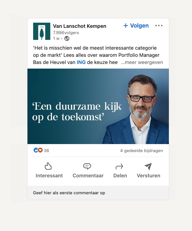 Het duurzaam opbouwen van vermogen is, zeker in een snel veranderende wereld, een complexe aangelegenheid. Met de Real Assets propositie creëert Van Lanschot Kempen transparantie in een ondoorzichtige markt. De klantreis laat zien hoe Van Lanschot Kempen op een toekomstbestendige manier investeert met een optimale balans tussen financiële opbrengst en positieve impact.